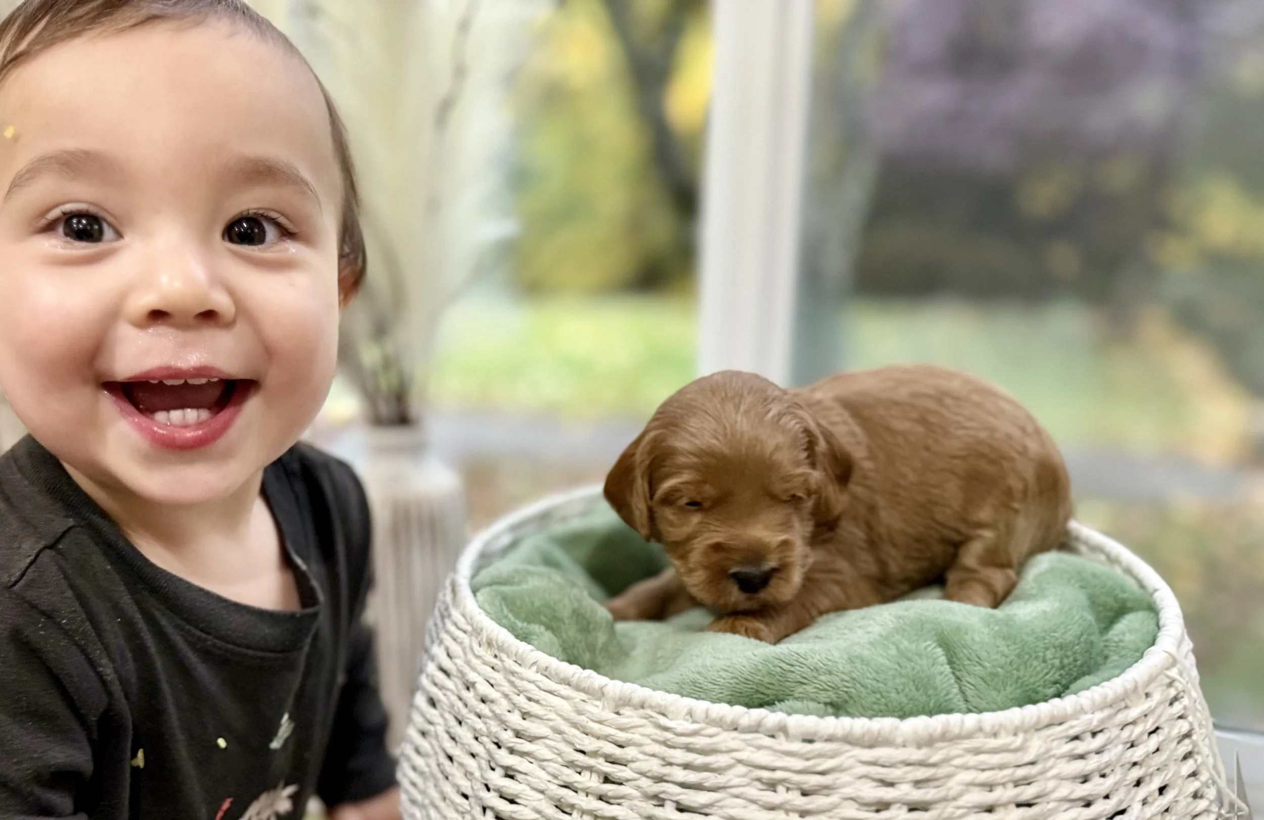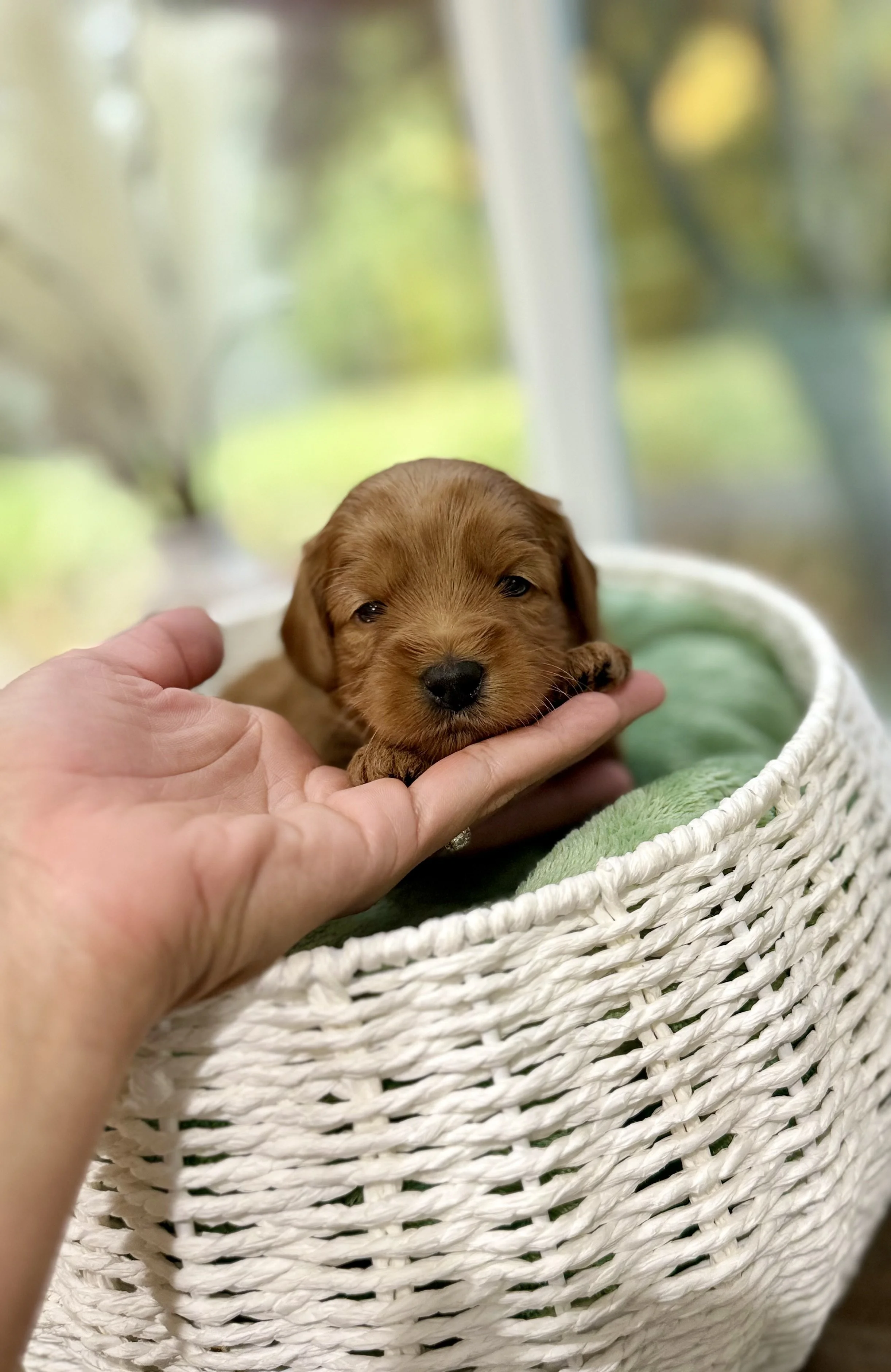 IN JUNE 2019, I STARTED RESEARCHING DIFFERENT DOODLE BREEDERS AND GOING BACK TO THEIR FIRST LITTER OF DOODLES. I STUDIED THEIR ETHICAL PRACTICES ON HOW THEY RAISED THE MOTHERS, PUPPIES, AND SELECTED BREEDING PAIRS. WITH YEARS OF RESEARCH, I STARTED TO VISUALIZE THE PERFECT GOLDENDOODLE. ONCE I FOUND THE PERFECT BREEDER TO START MY PROGRAM, I DECIDED TO WELCOME CLARICE INTO OUR HOME. LITTLE THEODORE ARRIVED A FEW MONTHS LATER. OUR VERY OWN PETITE STUD TO ENSURE THE INTEGRITY OF OUR PROGRAM AND TO GIVE US THE PERFECT PETITE/MINI GOLDENDOODLES.